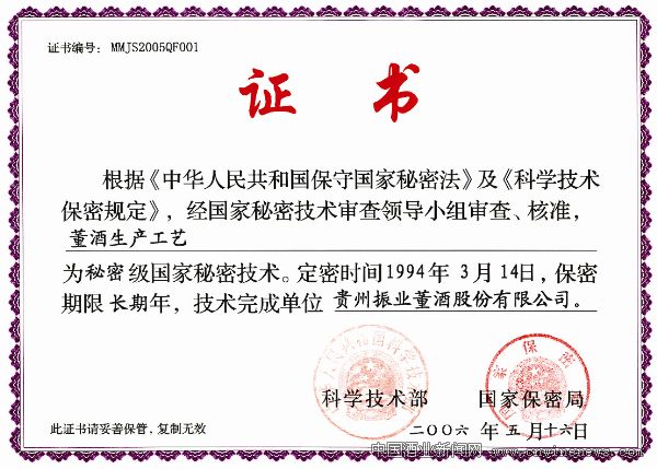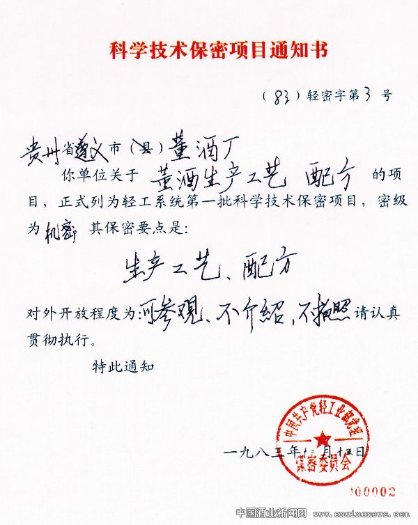 2006年,国家科学技术部和国家保密局将董酒的生产工艺列为秘密级国家秘密技术(见图三)。