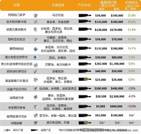 以具体产区的每公顷葡萄园价格而言,阿根廷门多萨最低价3万美元,最高价10万美元,平均涨幅达25%;意大利托斯卡纳最低价13.5万美元,最高价20万美元,平均涨幅达20%;新西兰霍克斯湾最低价13万美元,最高价17万美元,平均涨幅达15.4%;智利空加瓜谷最低价3万美元,最高价7万美元,平均涨幅达15%;美国纳帕谷最低价13.5万美元,最高价58.8万美元,平均涨幅达14.7%;澳大利亚巴罗萨谷最低价3万美元,最高价8万美元,平均涨幅达7.7%;意大利皮埃蒙特及伦巴第最低价20.2万美元,最高价120万美元,价格不变;西班牙杜罗河岸最低价4万美元,最高价5万美元,价格不变;英国英格兰东南部最低价2.5万美元,最高价3.5万美元,价格不变;法国卢瓦尔河谷最低价10万美元,最高价40万美元,平均跌幅达2%;法国波尔多最低价2.05万美元,最高价250万美元,平均跌幅达4.2%;南非西开普省最低价0.4万美元,最高价60万美元,平均跌幅达10%。