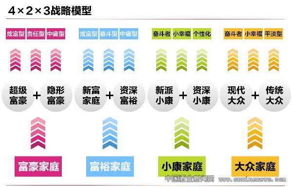因此,大众酒的竞争是2014年的一大主题。但是,酒业调整也不能一窝蜂地转向大众酒。应对大众酒时代的竞争,需要对大众酒时代重新定位,消费需求是品牌定位的原点,差异化是品牌定位的价值点,酒企要考虑能为消费者提供什么样的差异化的价值。而错位竞争是酒企可持续发展之本,利用“4×2×3战略模型”细分消费者人群,开展错位竞争。