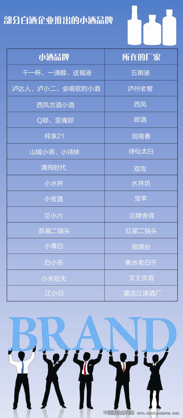 此外,衡水老白干也推出150ml装、市场零售价30元/瓶的时尚小酒“白小乐”;江苏双沟酿酒有限公司推出了125ml装的42度“清纯时代”;五粮液集团也实施大众酒战略,推出了“一滴醇”系列和“送福液”系列,其42度的100ml装“一滴醇”和52度的100ml装“送福液”都属于小酒系列,市场零售价30元/瓶左右。