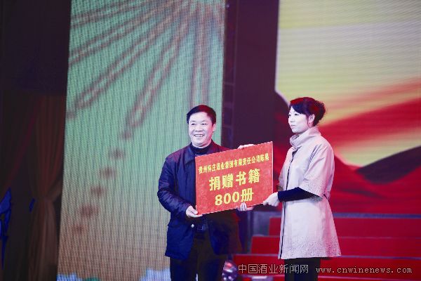 创办怀庄酒业公司的陈果(左)在仁怀市2012年春晩上捐赠书籍。
