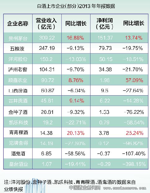 于是,随着2013年各大酒企市场应对策略的纷纷落地,其成果如何,自然能在年报中见分晓。截至记者发稿时,已有13家白酒上市公司发布2013年年报或业绩快报,另有3家上市公司未发布任何业绩消息。