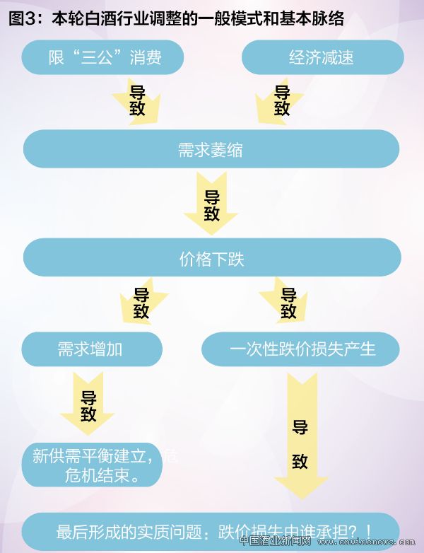 笔者认为:是什么导致了白酒需求萎缩?一是以突然硬着陆的方式出现的限制“三公消费”抑制了需求,二是始于2011年的经济减速。这两个因素共同导致白酒的需求萎缩。“三公”需求退出是极其快速的,是一夜之间就消失的,是一步到位的,目前“三公”需求退出已经完成,今后一段时间,影响白酒需求的变量主要是经济状态,具体来说就是GDP的增长率。GDP增长率向何处变化,我们无法预知,但两会期间国务院总理李克强已经给出了一个确定的边际,那就是7%的GDP增长率是保增长、保就业的底线。现在GDP的增长率是7.4%。换句话说,现在就在底线附近。由此可以说,整个GDP的下行空间已经被封住,从而因为经济发展速度变化导致的白酒需求变化,也相对见底进入稳定期。影响白酒需求的两个变量一个消失了,另一个稳定了,从而整个白酒需求的动荡就已经结束了。实际上,本轮调整(见图3)从本质上讲,是白酒对中国政治、经济进入到新发展阶段的适应和反映,目前白酒新需求与新的政治、经济背景已经达成一致,未来将长期依托于相对稳定的经济政治背景发展变化。目前,白酒行业正处于需求动荡消失、厂家和相关经营主体重新适应新需求的新阶段。