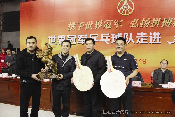 五粮液集团总经理、股份公司董事长刘中国在充分肯定中国乒乓球队做出的突出贡献的基础上表示,称雄全球的乒乓球团队的到来,五粮液已翘盼已久。更重要的是,在交流中建立友谊,在互动中拉近距离,用体育精神带动企业文化提升,激发蓬勃向上、永不言败的战斗力,对于我们在酒业调整时期永争第一、超越梦想有着非常现实的意义。