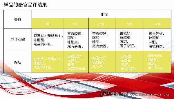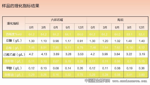 对比两种容器,贮酒12个月后,六环石罐固形物0.28 g/L,比陶坛高0.13 g/L;甲醇0.26 g/L,比陶坛低0.10 g/L;杂醇油0.75 g/L,比陶坛低0.05 g/L。六环石本身含有较多金属氧化物成