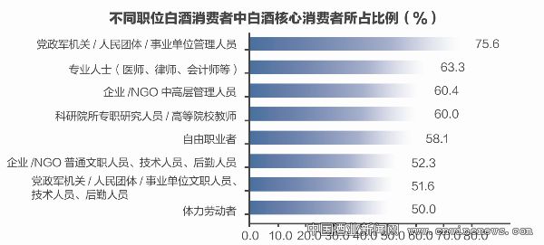 公务推动消费是中国白酒中高端白酒在最近十年快速发展的原因之一。零点指标数据公司《研究》中“不同职位白酒消费者中白酒核心消费者所占比例”的图表,可直观地看出过去白酒行业对政府和公务消费的倚重。