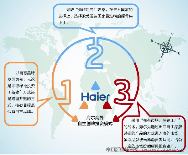 海尔的海外战略绝对是中国的一个另类,早在20世纪80年代,海尔集团总经理张瑞敏就提出了“创海尔世界知名品牌”的战略。海尔海外自主创牌的投资模式很是另类。主要表现:一是企业出海投资以自有品牌发展为先,无论采取绿地投资(新建)方式还是跨国并购方式,核心目标是保有自主品牌;二是采取“先难后易”攻略,海尔在进入国家的选择上,不按常理出牌,选择欧美发达国家最难啃的硬骨头下手,海尔集团在海外投资办厂时,坚持打海尔的牌子,投资方是海尔,生产和销售的产品还是海尔品牌。但是,海尔的国际化是在于本土化融合下进行的,海尔在美国和欧洲实施设计、生产、销售“三位一体”的本土化战略。海尔的海外战略中,除了过人的自主品牌战略和“先难后易”攻略外,还有“先有市场,后建工厂”的战术。海尔先通过出口自主品牌过硬的产品的方式进入海外市场,争取品牌被当地消费者认同、占领一定的市场份额后再投资建厂。
