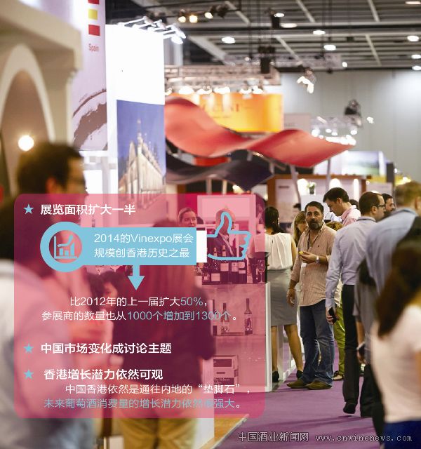2014的Vinexpo展会规模创香港历史之最,增加2个展厅,总展览面积达到15000平米,比2012年的上一届扩大50%,参展商的数量也从1000个增加到1300个。在中国葡萄酒消费下滑,对高端葡萄酒需求减少的大背景下,展览面积的信息至少表明,世界葡萄酒行业仍对亚洲地区保持高度的关注。