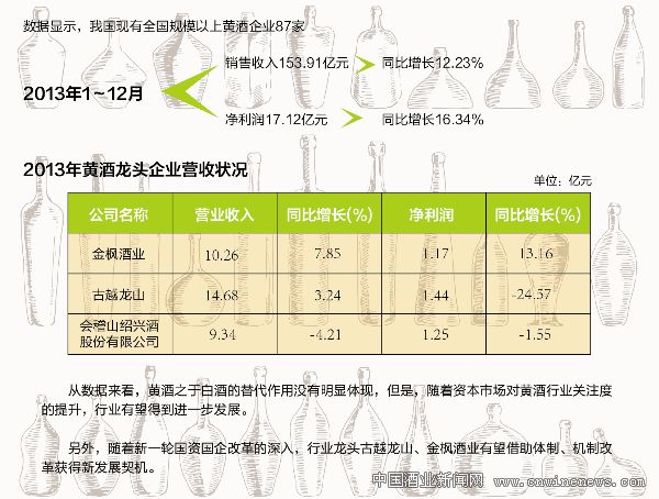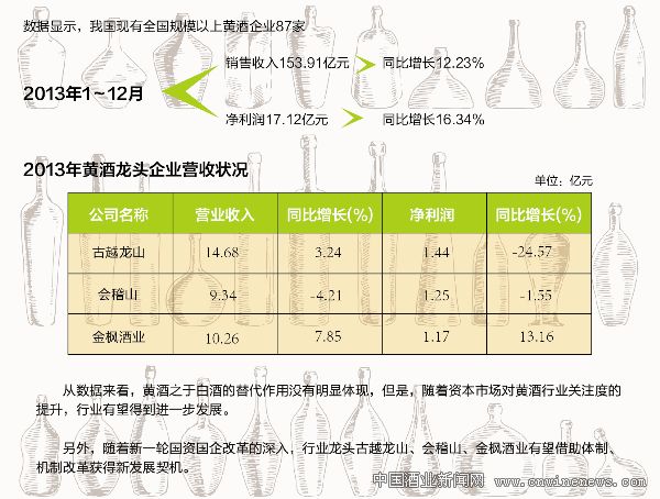数据显示,我国现有全国规模以上黄酒企业87家,2013年1~12月完成销售收入153.91亿元,同比增长12.23%;实现利润17.12亿元,同比增长16.34%。