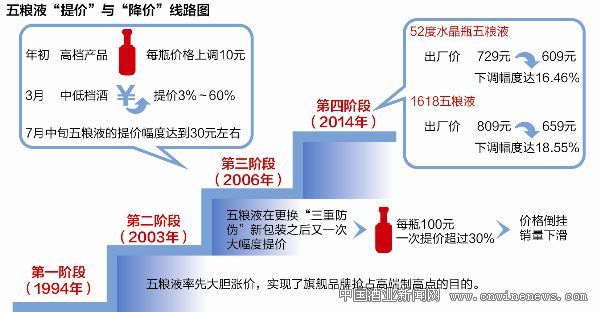 20多年来,五粮液经历了三个提价阶段的考验,其情况如何呢?对此,《华夏酒报》记者经过一番调查后,疏理出了一个提价线路图。
