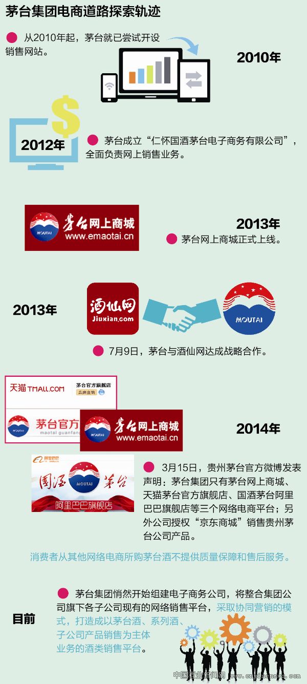 2014年初,当茅台宣布与之合作的电商平台只有子公司仁怀国酒茅台电子商务公司运营的茅台网上商城、天猫茅台官方旗舰店、国酒茅台阿里巴巴旗舰店等三个网络电商平台,另外授权“京东商城”销售贵州茅台公司产品时,有关其下一阶段电商化如何推进的猜测纷纷涌起,而如今,茅台试图组建电子商务公司,整合旗下子公司现有网络销售平台的消息传出。似乎茅台的电商化路径已经有了新的方向。