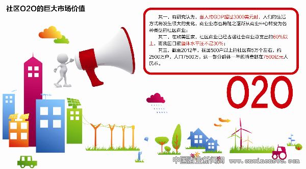 相关数据也验证了社区O2O的巨大市场价值。其一,有研究认为,当人均GDP超过3000美元时,人们的生活方式将发生很大的变化,商业业态也将随之逐渐从商业中心转变为各种类型的社区商业;其二,在欧美国家,社区商业已经占据社会商业总支出的60%以上,而我国目前整体水平还不足30%;其三,截至2012年,我国500户以上的社区有5万个左右,约2500万户,人口7500万,这一部分群体一年的消费额在7500亿元人民币。