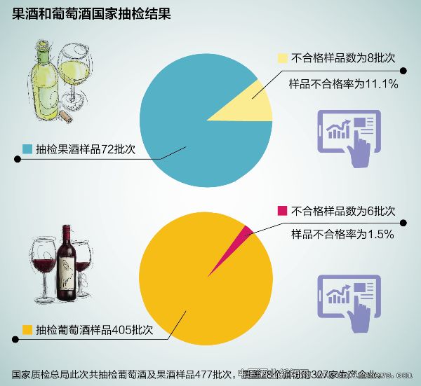 在此次全国范围内的抽检中,葡萄酒及果酒是食药监总局重点监督的食品领域。本次抽检葡萄酒及果酒样品477批次,涉及28个省份的327家生产企业。其中,抽检果酒样品72批次,不合格样品数为8批次,样品不合格率为11.1%;抽检葡萄酒样品405批次,不合格样品数为6批次,样品不合格率为1.5%。