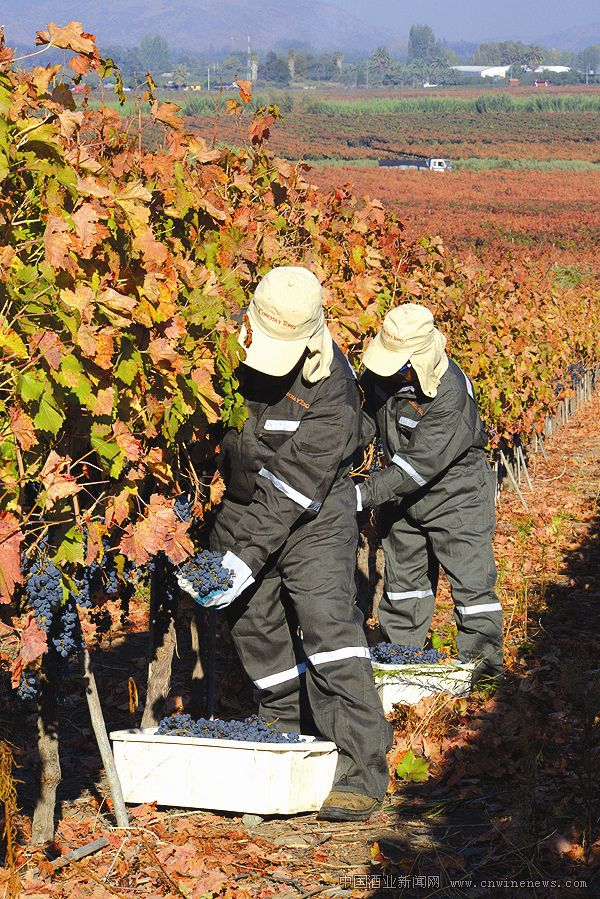 在智利第六大葡萄酒产区卡恰布谷 (Cachapoal Valley),工人们正在忙着采收佳美娜葡萄。