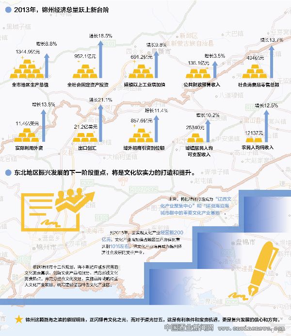 今年,锦州市持续加大教育、科技和文化体制的改革力度,支持企业自主创新,加快建立产、学、研三方协同创新机制,并支持社会资本参与文化产业发展,在当地加快打造国家级古玩交易中心,建设包装印刷产业基地。根据锦州市“十二五”规划,将不断适应城乡居民的文化消费需求,创新文化产品和服务,培育形成文化消费热点,并充分整合文化资源,实施品牌战略和重大文化产业项目,统筹建设辽西特色文化产业区,到2015年,要实现文化产业经营额200亿元,文化产业增加值占地区生产总值比重达到10%左右,把文化产业培育成为锦州经济社会发展的支柱产业。未来,将把锦州打造成为“辽西文化产业聚集中心”和“环渤海沿海城市群中的重要文化产业基地”。