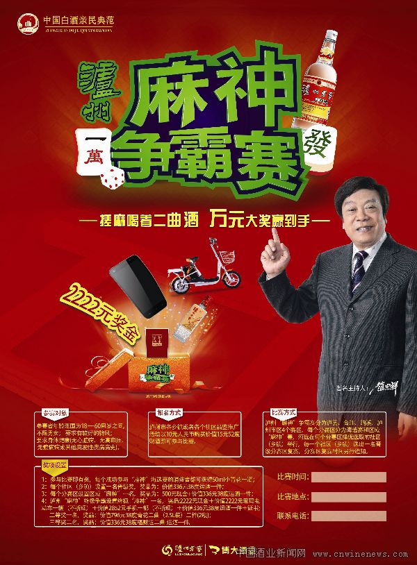 据活动组委会透露,本次大赛以四川麻将为比赛规则,形式较为简单,广大麻将爱好者可通过各社区、终端海报获取比赛信息,通过电话咨询现场报名即可,而且对选手没有过多要求,只要身体健康,牌风良好,均可报名参加。最重要的是,泸州老窖二曲为本次大赛提供了丰厚的奖品,设立了麻神、优秀奖、纪念奖等不同奖项,其中麻神得主将获得由泸州老窖二曲提供的人民币2222元现金大奖、价值人民币2222品牌电动车一辆、价值人民币2852元的高端定制手机一部,以及泸州老窖二曲运酒等丰厚奖品组成的大礼包一份。