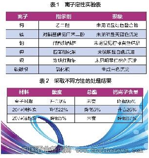 取20瓶该沉淀酒样过滤出结晶物质,将结晶分别倒入100ml水中和酒精中,得出结论是此文章来源华夏酒报沉淀物质易溶于水,而不溶于酒精,初步定性为某金属的无机盐类物质。做排除实验,取10瓶酒的沉淀物加蒸馏水洗脱至500ml,分成10份分别加指示剂定性。结果见表1。