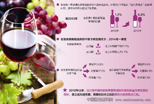 从中国市场来看,在政府严厉打击奢侈消费的举措下,高端进口葡萄酒在中国市场的销售普遍下降,但勃艮第葡萄酒对中国的出口却逆势上涨。2010年以来,出口至中国的勃艮第葡萄酒的价值和数量均有显著的增长,使之成为继美国、英国和日本之后的第四大勃艮第出口地。