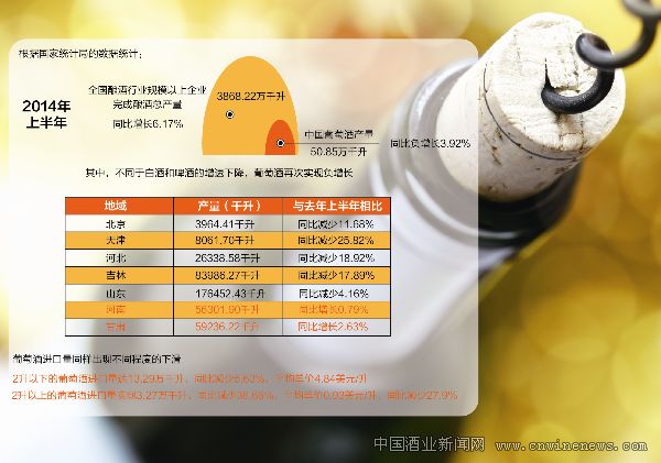 根据国家统计局的数据统计,2014年上半年,全国酿酒行业规模以上企业完成酿酒总产量3868.22万千升,同比增长6.17%。其中,不同于白酒和啤酒的增速下降,葡萄酒再次实现负增长,1~6月,中国葡萄酒产量50.85万千升,同比负增长3.92%,销售收入实现191.70亿元,同比增加0.37%,利润实现19.91亿元,同比减少5.16%。