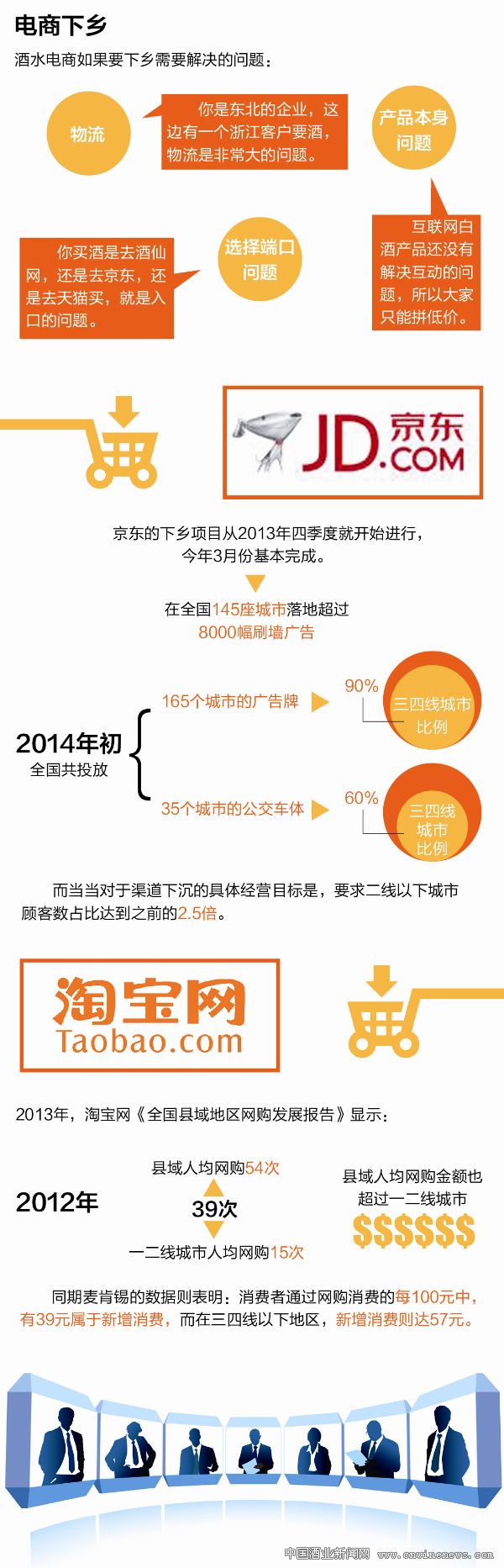 京东的下乡项目从2013年四季度就开始进行,今年3月份基本完成,目前,已经在全国145座城市落地超过8000幅刷墙广告。与此同时,京东还在2014年初在全国七大区共投放165个城市的广告牌,其中,三四线城市比例为90%;投放35个城市的公交车体广告,其中,三四线城市比例为60%。