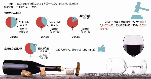 但在阿奇等拍卖行看来,波尔多佳酿的地位下降非常明显。Kapon说,今年波尔多佳酿只占阿奇行总成交额的30%,而2012年和2013年分别高达50%和40%。尽管缺乏来自价格最高的波尔多佳酿的支撑,阿奇行在今年上半年的成交额仍然达到了3,200万美元,仅略低于2013年同期的3,350万美元。