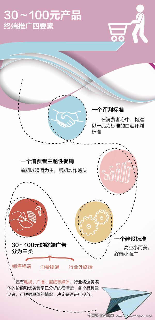 消费终端则主要是B、C、D类餐饮终端。30~100元价位的白酒,主要在这三类餐饮店中消费,由于小餐饮终端的特性,一般会以聚群的形式出现,所以消费终端的建设更容易形成集群效应。为此,30~100元价位白酒的消费终端建设可以概括为“餐饮一条街工程”。