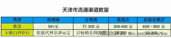 天津市区超市系统整体发达,有大中型商超约500家,其中经营面积在1万平方米以上的大卖场40家以上,基本上集聚了全国大部分的零售巨头,在节假日及店庆期间,大众价位白酒销售能力较强。