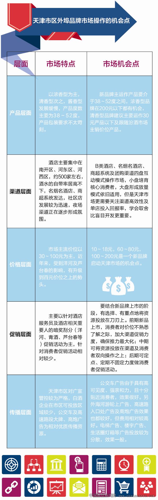 价格层面:市场主流价位以30~100元为主,近年来受到洋河及芦台春影响,有升级到百元价位之上的势头。10~18元、60~80元、100~200元是一个新品牌启动天津市场的机会点。