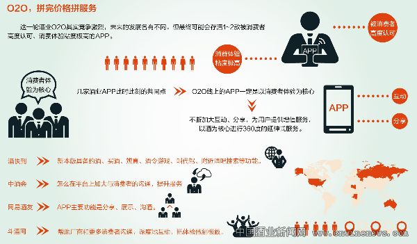 谁生谁死尚未定论,而上述几家APP此时此刻的共同点则是一致认为O2O线上的APP一定是以消费者体验为核心,不断加大互动、分享,为用户提供增值服务,以酒为核心进行360度的延伸式服务。