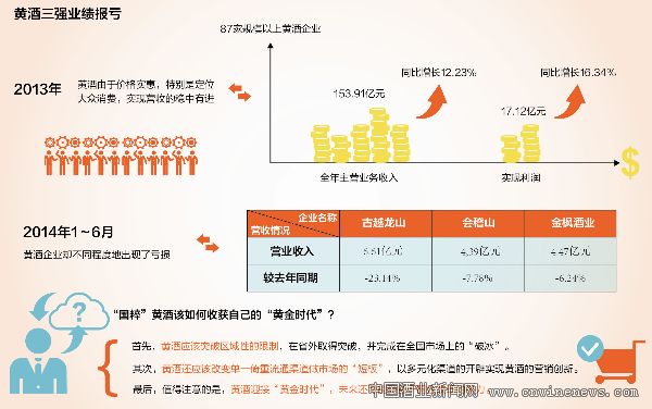 亏损不限于会稽山一家。黄酒行业龙头企业古越龙山公布的半年报显示,2014年上半年公司实现营业收入6.61亿元,同比减少23.14%;实现净利润6331.71万元,同比减少38.39%。对于业绩大幅下滑的原因,古越龙山解释称,受宏观政策和市场环境影响,竞争更加激烈,酿酒行业整体效益不佳,公司收入和利润都有所下滑。