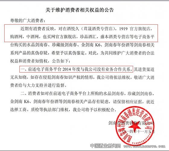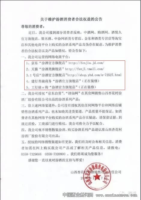 从五粮液、汾酒发布的公告中可知:五粮液、汾酒的电商指定销售渠道目前只有京东等少数电商平台,并没有购酒网、茸晟酒类专营店等电商平台。