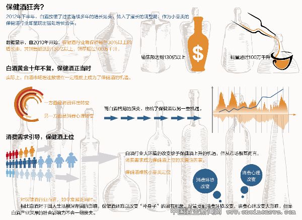 自2012年下半年,白酒放缓了过去连续多年的增长势头,转入了漫长的调整期;但与此同时,作为小品类的保健酒行业却呈现出强劲增长势头,数据显示,自2010年开始,保健酒行业就保持每年30%以上的增长率,其销售额达到130亿以上,销量超过100万千升。