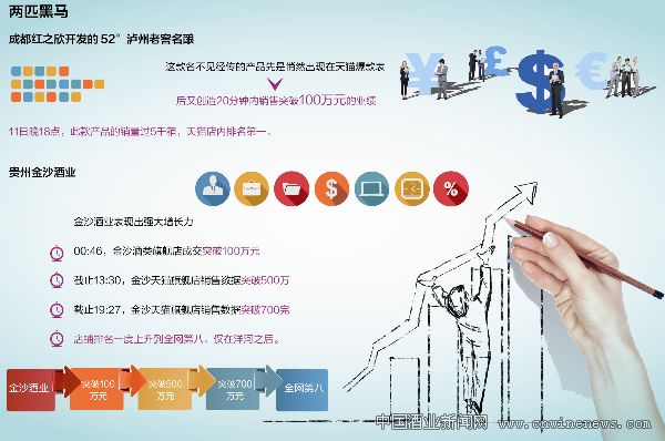金沙酒业以成交金额768万排名天猫酒类电商第八。据了解,为打响“双11”,金沙酒业专门推出了电商专属产品“三斤装封坛原浆”,1万坛提前25天进入天猫“双11”预售通道,199元的高性价比定价引发网友抢购,共计卖出19400余坛,成交360余万元,约占总成交额的一半。