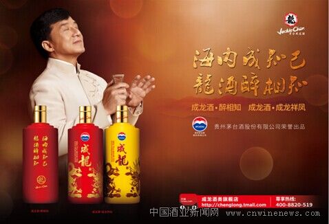 2014年中秋,顺应市场发展趋势,贵州茅台酒股份有限公司、国际巨星成龙先生、奢侈品帝国北京耀莱集团联袂重磅推出“成龙酒”系列之“成龙酒•醉相知”和“成龙酒•成龙祥凤”,主力消费人群瞄准中低端大众消费市场。由北京耀莱金榜酒业有限公司全国总运营。