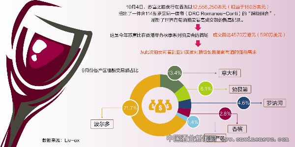 10月4日,苏富比拍卖行在香港以12,556,250港元(相当于160万美元)拍出了一件含114瓶罗曼尼—康帝(DRC Romanee-Conti)的“超级组合”,刷新了世界葡萄酒拍卖最高成交额的新高纪录。