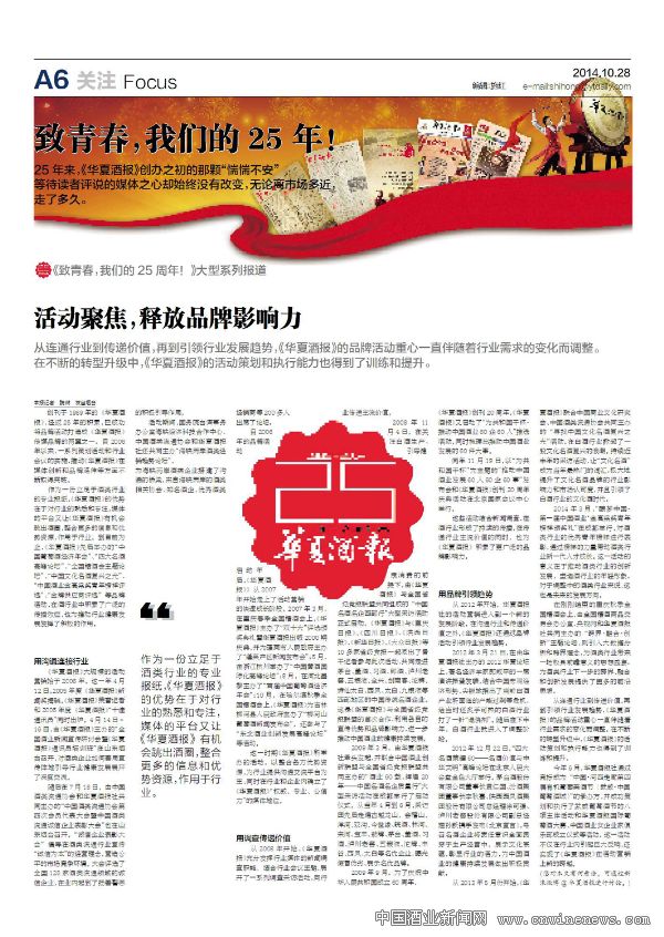 当我们循着活力酒业的强劲脉搏一路走来,却恍然发现,《华夏酒报》早已与酒业活力融为一体,这份报纸本身就是活力和希望。《华夏酒报》与酒业相约25载,同庆25岁生辰,这是活力酒业的一场欢乐盛会,是活力酒业的一曲高亢颂歌。伴着这欢乐颂歌,酒业未来大幕已经拉开。