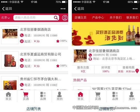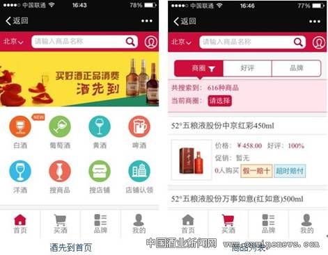 据悉,首批开通的专卖店都是茅台、五粮液、剑南春、泸州老窖、洋河等名酒品牌厂商正式授权的专卖店、直营 店,已全面覆盖所属城市各区县。用户无需下载APP,只需关注“酒先到”微信服务号,从“首页”进入“酒先到”平台,点击“买酒”就可以通过选择商圈,查询到自己所处商圈附近10公里范围内的品牌酒类专卖店、直营店所发布的酒类商品信息,选择想要的商品和店铺,直接拨打商文章来源中国酒业新闻网户电话或在“酒先到”上向商户下订单等待商户回拨,即可与商户确定酒品、数量、送货时间、地点等交易内容,享受正品专卖店、直营店的高品质服务。目前,大部分专卖店都可承诺1小时内送达,如急需,用户还可与商户商议送货时间。