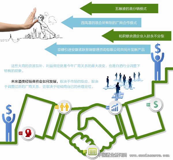 五粮液的直分销模式、西凤酒的混合所有制的厂商合作模式、和君联合酒企业入驻永不分梨、京糖引进安徽孟跃营销管理咨询有限公司共同开发新产品等等,资源互补、利益绑定是今年厂商关系的最大改变,也是白酒行业调整下特有的现象。