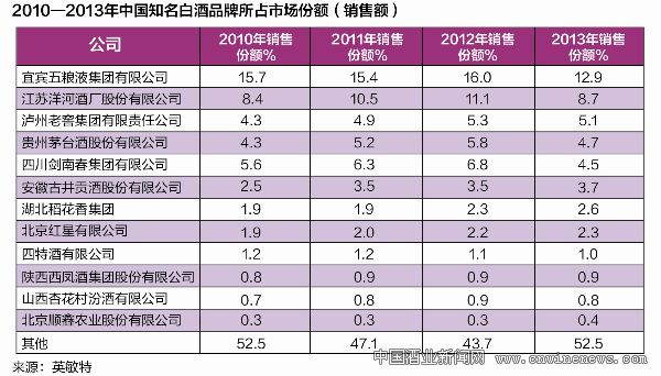 白酒行业的巩固整合在2013年突然中止,前十大品牌的市场占有率从2012年的55.4%急速跌落至2013年的46.2%。这使得前十大白酒品牌的市场占有率回落至2010年水平,抵消了2010至2012三年间的连续增长。