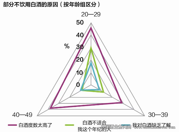 重点分析:在外国产品和文化流入的影响下,年轻人更乐于接受海外的新奇烈酒。而白酒在与此同时逐渐失去了魅力与光彩。虽然他们并不见得认为白酒“过时”,但白酒显然已不新颖时尚了。