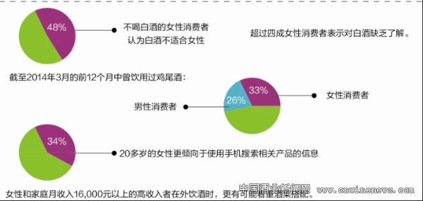 在吸引越来越多的女性消费市场方面,白酒已经远远被洋酒抛在身后。提供迎合女性味蕾的新产品是使白酒更适合女性的一个出路;酒精浓度更低,口感更绵柔,甚至添加甜味剂和水果风味的白酒有可能帮助白酒赢得女性的青睐。比如,当很多外国烈酒和白酒面临巨大市场压力时,帝亚吉欧旗下的百利奶油威士忌却逆市上行,收获了超过30%的年增长率。百利在中国市场的此番成功让白酒品牌领悟到如何吸引女性消费者的秘诀。喝纯爱尔兰威士忌可能会使女性消费者避而远之,但与奶油混合成乳状就使其一下子变得魅力四射。