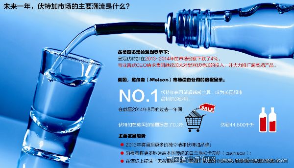 与此同时,在英国,尼尔森(Nielson)市场调查公司的数据显示,伏特加有可能超越威士忌,成为英国超市最畅销的烈酒。在截至2014年8月的过去一年间,伏特加的销量提高了0.3%,达到44,600千升,而且这种增长势头预计将持续到2016年。相比之下,混合威士忌的销量下跌1.7%,为49700千升。