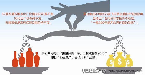 首先,维护两家的合理价格底线和市场价格体系。“茅五”共同打出“控量保价”拳,五粮液将在2015年坚持“控量稳价,量价均衡”战略。52度普通五粮液出厂价格609元/瓶不变,1618出厂价保持不变,五粮液低度系列保持目前价格不变。