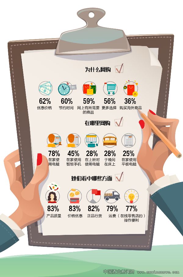 更为惊人的是,数据显示,63%的女性至少每天上网浏览一次,67%的女性网购比起配偶多,62%的女性大部分时间在为自己买东西。对于为何执着于网购,女性认为网购能够节省时间,享受优惠价格,有更多的选择空间。