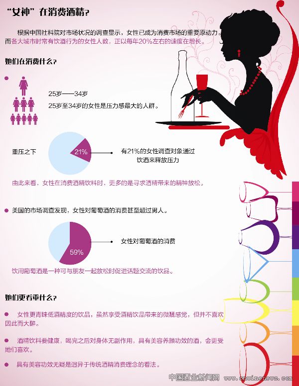 从各个迹象上看,我国女性消费群体在酒类市场中也正在崛起,根据中国社科院对市场状况的调查显示,随着内地经济迅速增长,女性已成为消费市场的重要原动力。而各大城市时常有饮酒行为的女性人数,正以每年20%左右的速度在增长。