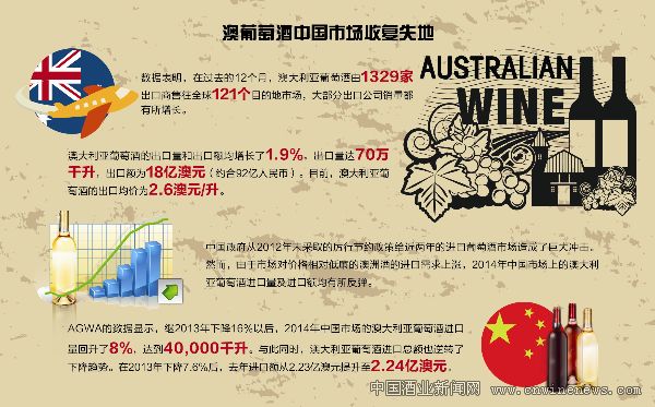 澳大利亚葡萄酒管理局(Australian Grape and Wine Authority,简称AGWA)的数据显示,尽管受到中国厉行节约的政策影响,澳大利亚瓶装葡萄酒对中国市场的出口总量仍然上升了8%;对中国市场的瓶装葡萄酒出口额也出现增长,已经恢复到该政策实施之前的水平。