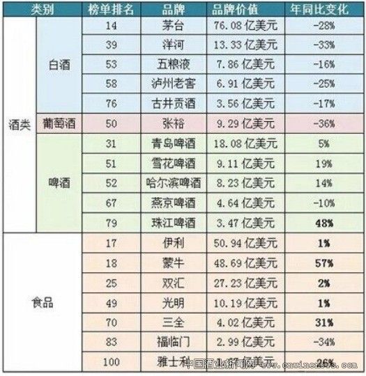 本次排行榜单中,共有11个酒类品牌、7个食品品牌入围百强名单。而酒类品牌中,分别为5个白酒品牌、1个红酒品牌和5个啤酒品牌。茅台、洋河、五粮液分别以76.08亿美元、13.33亿美元、7.86亿美元的品牌价值,位列白酒类文章来源中国酒业新闻网行业前三。泸州老窖和古井贡酒分别以6.91亿美元、3.56亿美元居白酒类行业第四、第五。张裕以9.29亿美元的品牌价值成为葡萄酒行业唯一入围的品牌,位居榜单第50名。而贵州茅台在2012年就首次以118.38亿美元的品牌价值入选此榜单,位列全球最具品牌价值企业排行榜第69位。