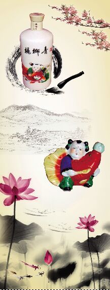 杨柳青酒瓶,系圆柱型,高23厘米,其容量为750ml,是天津佳酿酒厂的专用瓶。圆型的瓶壁上,除酒名外,即是一大幅年画,一个身着绿色小袄的胖男娃儿,怀抱一条赤红色鲤鱼,调皮地坐在地上,右手还拿着一支含苞待放的荷花。