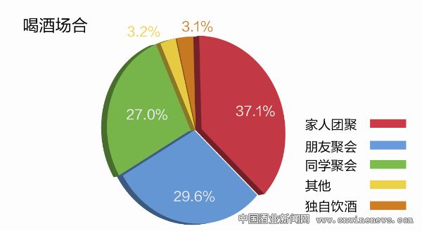 新浪河南的调查显示,家人团聚占37文章来源华夏酒报.1%,朋友聚会占29.6%,同学聚会占27.0%,自饮及其他共占6.3%。九州糖酒网获得的数据也基本相当,家庭聚会占37.96%,同学聚会占21.3%,朋友聚会占28.7%,自饮及其他共占12.04%。
