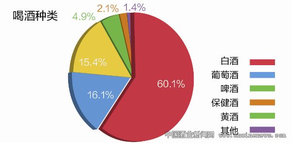 新浪河南调查结果显示,春节期间,喝白酒的人数占60.1%;其余,葡萄酒为16.1%,啤酒为15.4%,黄酒、保健酒及其他的份额加一起还不足10%。九州糖酒网调查结果显示,春节期间,喝白酒的人数占56.12%;其余,葡萄酒为21.43%,啤酒为6.12%,黄酒、保健酒及其他的份额加在一起则为16.33%。